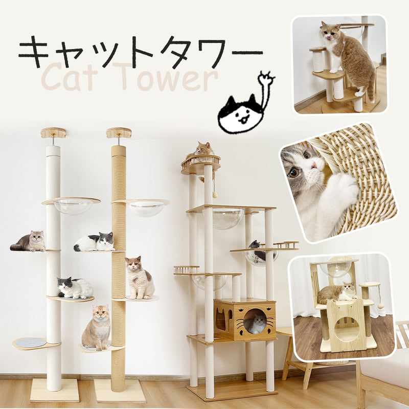 RAKU キャットタワー 突っ張り 木製 高さ183-270cm対応 ホワイトコットン/天然麻 木登りタワー シングル 猫タワー 省スペース スリム 爪とぎ おしゃれ 可愛い 賃貸 太い支柱 安定性抜群 多頭飼い 大型猫 シニア キャットツリー