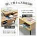 天板下収納とサイド棚付きでノートPC、雑誌、小物をすっきり収納。隠す収納と見せる収納を使い分けてリビングを美しく保てます。収納付きリフトアップテーブルとして在宅勤務にも最適。