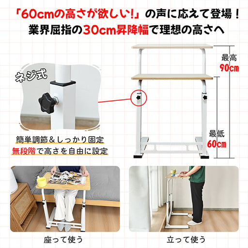 詳細を全部見るRAKU サイドテーブル 昇降式 キャスター付き 高さ無段階調節 高さ60~90cm 幅60cm コの字型 介護テーブル ネジ式 木目調 組立簡単 移動楽々 安定 ベッド横 在宅ワーク 多機能