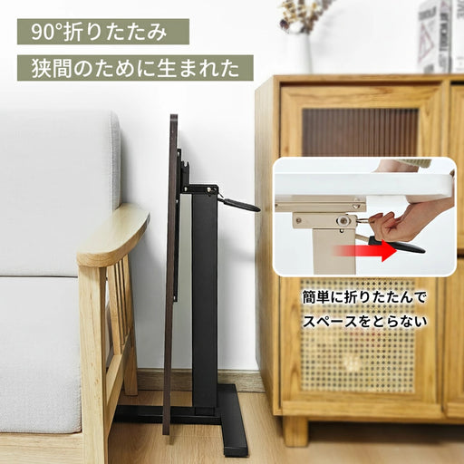 【折りたたみ式でコンパクト収納】使用しないときは折りたたんで収納できる省スペース仕様。女性の方でも簡単に扱え、移動や保管もラクに行っていただけます。【広めの天板で使いやすい】天板は約80cm×40cmのワイドサイズで、木目調の天板とスチールフレームを組み合わせたシンプルなデザインです。どんなイ...