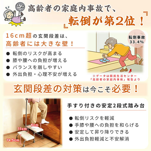 【玄関の段差を安全に昇り降りできる踏み台】玄関の高い段差による転倒リスクや足腰への負担を軽減する、手すり付き2段式の踏み台です。1段ごとの高さは高齢者・妊婦・子どもにも優しく、安全に玄関を昇り降りできます。【壁面ぴったり設置の安心構造】壁面にぴったり設置できる設計で、グラつきを抑え、万が一の転...