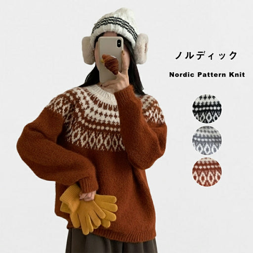 【7日内出荷】ニット セーター レディース ノルディック柄 フェアアイル柄 トップス プルオーバー 長袖 クルーネック 韓国ファッション きれいめ カジュアル ゆったり 体型カバー あったか 防寒 厚手 おしゃれ 秋冬 クリスマス デート服 通勤 通学