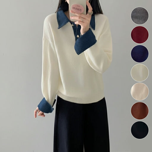 【7日内出荷】ニット セーター レディース レイヤード風 重ね着風 デニム襟 ポロ襟 バイカラー トップス プルオーバー 長袖 韓国 きれいめ カジュアル 大人可愛い ゆったり 体型カバー あったか 防寒 おしゃれ 秋冬 通勤 通学 オフィス デート お出かけ