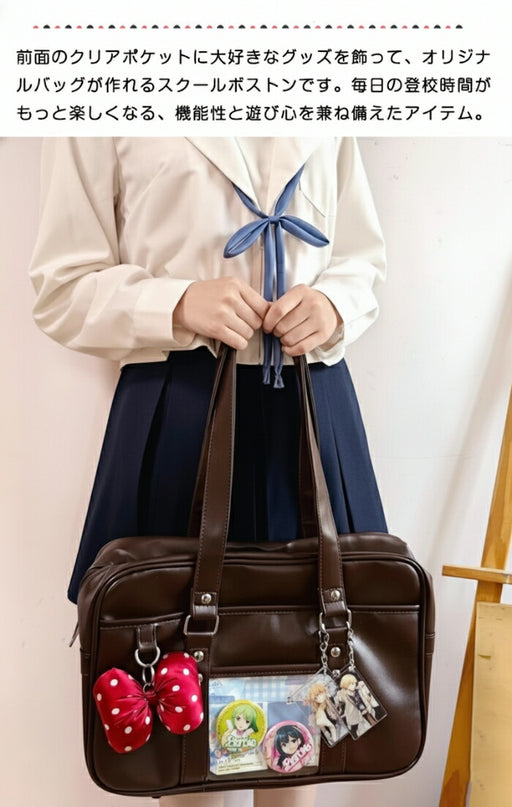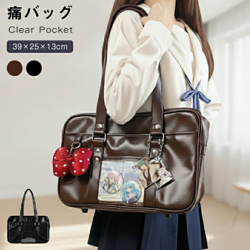 詳細を全部見る【7日内出荷】痛バッグ スクールバッグ JK ショルダー 大容量 合皮 PU 中学生 高校生 女子高生 バッグ トートバッグ 防水 底鋲付き レディース 防水 肩掛け 斜め掛け 手提げ 通学カバン クリア 見せバッグ 推し活 制服 JK鞄 可愛い おしゃれ 黒 茶
