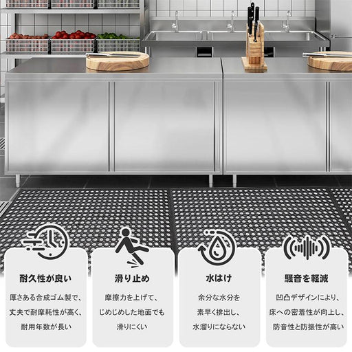 【全面水抜けデザイン】穴が開いたデザインにより、優れた水はけを実現し、水たまりの心配がありません。排水穴の構造により、水、油、汚れを効果的に排除し、表面を清潔に保ちます。 【防音性・防振性】キッチン、浴室、入口などさまざまな場所での使用において、有孔マットは滑り止め効果を提供するだけでなく、騒...