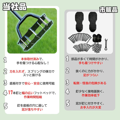 商品紹介 【17本金属スパイクで効率UP】長さ8.5cmの高耐久金属スパイクを17本搭載しており、土の奥深くまでしっかりと挿し込むことができます。17本のスパイクが同時に作業を行うことで、往復回数を減らし、作業効率を大幅に向上。時間と労力を節約しながら、よりスムーズな作業を実現します。プラス...