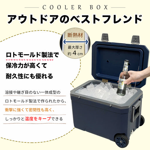 RAKU クーラーボックス 45L約120時間保冷 大容量 保冷剤付き 持ち運びやすい ハンドル&キャスター付き ゴムラバー 高密閉性 水抜き栓 カップホルダー 頑丈 車載 レジャークーラー アウトドア キャンプ/BBQ/お釣り/防災