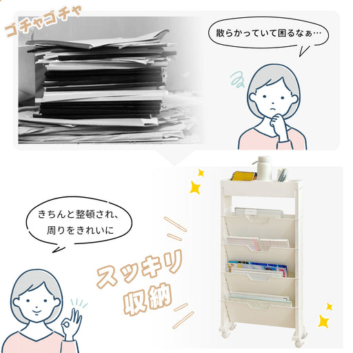 詳細を全部見るRAKU 書籍収納ワゴン 5段式 頑丈で大容量 約60冊入れ 分類収納 スリム オープンタイプ 取り出しやすい キャスター/ストッパー付き 学生/受験生 オフィス/書斎/教室 資料整理 教科書/文房具入れ 効率上げ おしゃれ