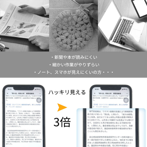 【スタンド式ルーペ】お好みの角度に合わせて自由に曲がるスタンドルーペです。両手を解放、プラモデル作り、ネイルのお手入れなどの細かい作業に最適です。邪魔にならず肩にかけて、机に立てて使用できます。【視野が広い】サイズ約18cmx12cmの四角形ルーペなので、広範囲を見やすく拡大できます。年配の方...