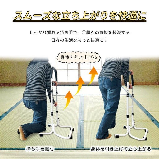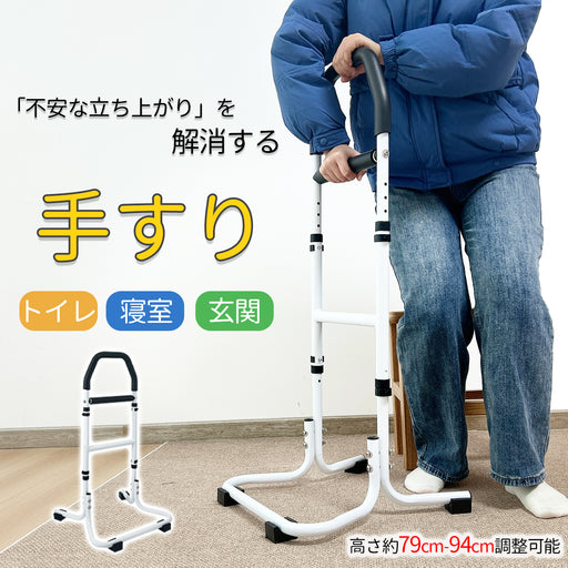 詳細を全部見るRAKU 立ち上がり手すり 転倒防止 高さ約79cm-94cm調整可能 ハイタイプ 2重持ち手 八字型ベース 耐荷重約100KG アルミ製 クッション・脚パット付き 軽量 安定